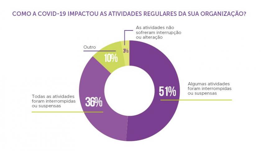O coronavírus deixou ainda mais claro o papel de responsabilidade devotado das OSCs. Enquanto 51% narraram ter suas atividades regulares interrompidas ou suspensas, 36% informaram a paralisação total das operações.